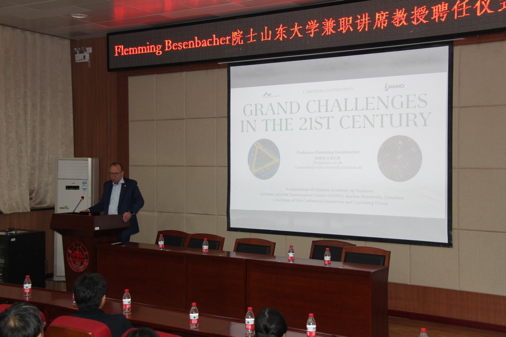 仪式后,Flemming Besenbacher教授做客胶体与界面化学讲坛,做了题为“Grand Challenges in the 21st Century”学术报告。报告中,Flemming Besenbacher 教授列举了当前全球面临的危机与挑战,比如环境污染、能源枯竭、医疗健康等,并重点强调了应用科学技术来解决当前问题的策略和方法,进而提出“education 4.0”的新工科教育理念,认为未来工科教育的发展应该更多的以解决全球问题为导向,打破专业壁垒,鼓励多学科交叉的新教育模式。在提问环节,同学们就自己感兴趣的问题积极提问,Flemming Besenbacher教授院士认真、仔细地给出了自己的解答。9778818威尼斯部分教师、研究生听取了报告。