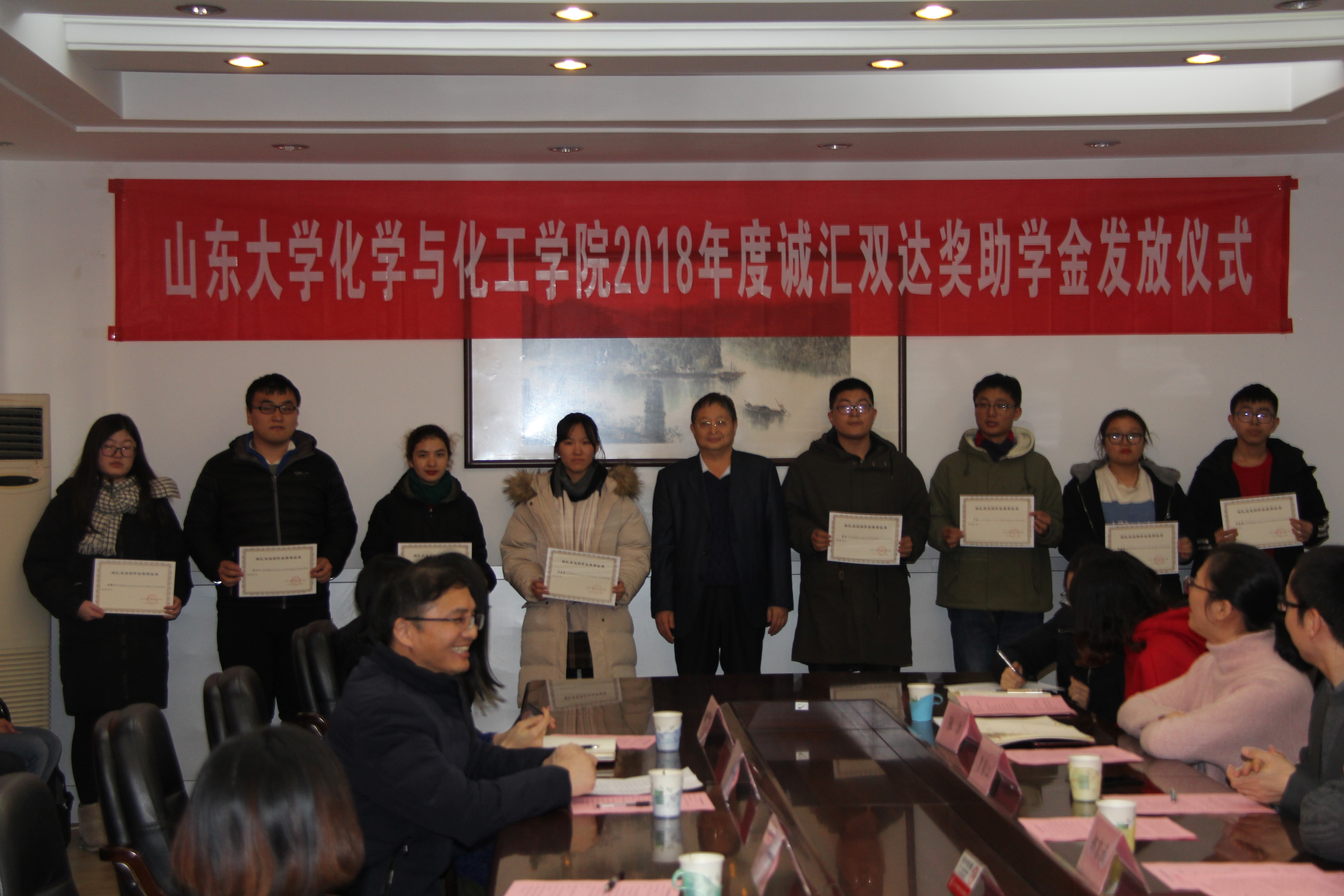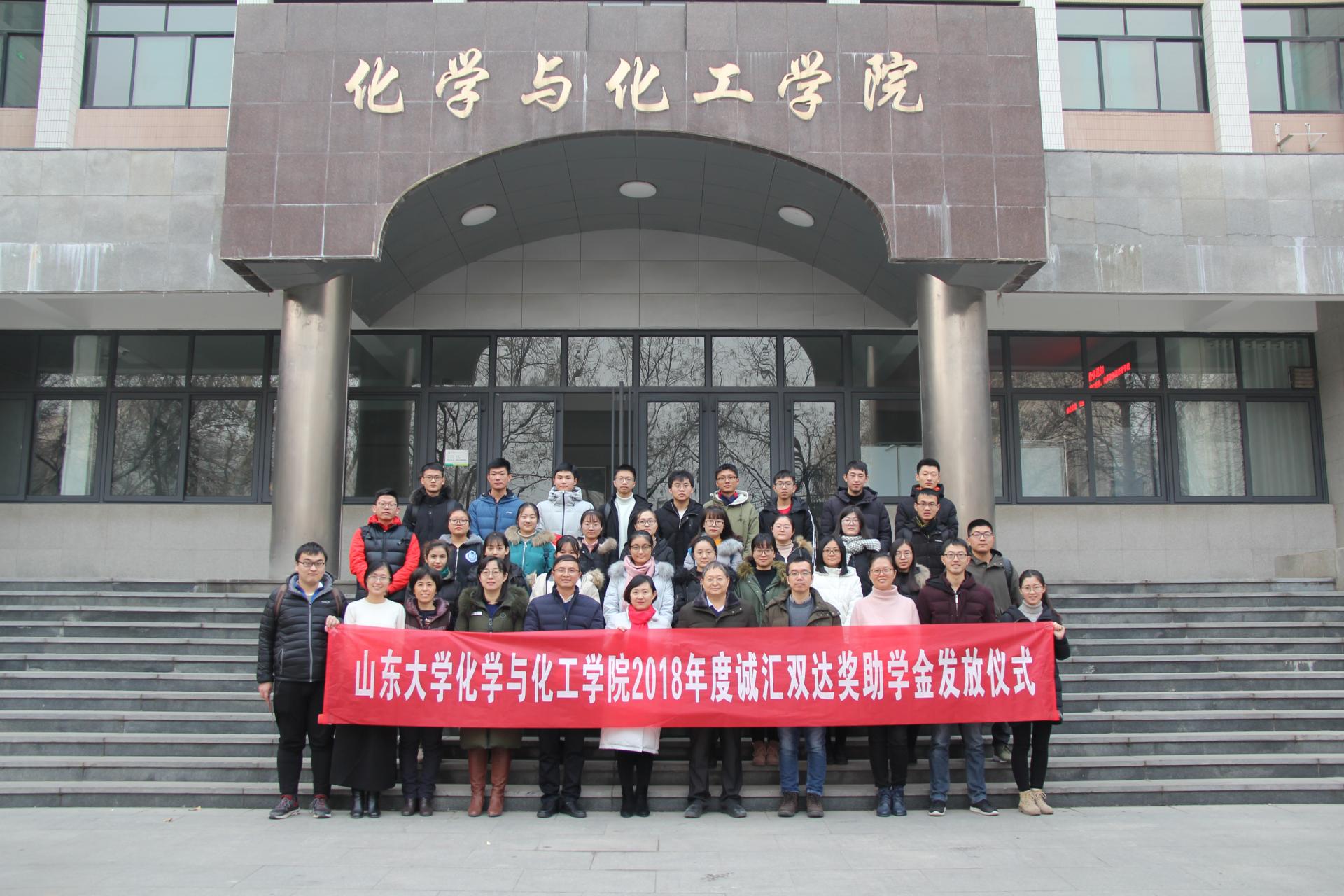 济南诚汇双达化工有限公司成立于2002年,是国内专业生产、销售医药原料药、中间体、高端精细化工产品的高新技术企业;2014年整合现有技术、资源,引入战略合作者,在德州平原建设了具有国际标准的山东诚汇双达药业,占地200亩,总投资4.5亿元。2018年10月,诚汇双达与化学院签订合作协议,将连续五年每年出资10万元,设立“诚汇双达奖助学金“,奖励品学兼优的学生;同时双方也将在科学研究、社会实践等多方面展开合作交流。本年度,学院共有7名研究生、15名本科生获得诚汇双达奖学金,9名本科生获得诚汇双达助学金。