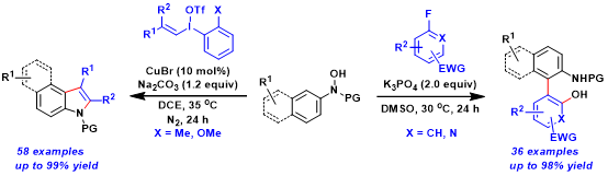 胶体与界面化学教育部重点实验室、有机化学研究所高洪银课题组在含有活泼SP3C-H键的选择性芳基化反应、芳基羟胺类底物的O-烯基化、O-芳基化串联反应等方面取得一系列重要进展。1.通过对碱和溶剂的系统考察,发现以廉价易得的叔丁醇钾作为碱,二甲亚砜作为溶剂,在敞口的反应瓶中室温下15分钟就可以实现一系列含有活泼碳-氢键的反应底物与硝基苯类化合物的C-H键芳基化反应,摆脱了类似反应对价格昂贵的过渡金属催化剂(比如钯、铑等)的依赖,并且反应条件极为温和且操作简便。该研究成果发表在Chemical Science(Chem. Sci. 2018, 9, 7992-7999.)上。2.从易于合成的芳基羟胺类反应底物出发,分别通过铜催化下与烯基高价碘试剂的反应和无机碱存在下与缺电子芳烃的反应,分别实现了O-烯基化、O-芳基化反应,借助高活性中间体的3,3-重排反应及后续的芳构化反应等串联反应历程,高效地合成了一系列结构多样性的吲哚类产物和多官能团化的联芳基类化合物。相关研究成果分别发表在ACS Catalysis(ACS Catal. 2019, 9, 3906-3912.)和Organic Letters(Org. Lett. 2019, 21, 2894-2898.)上。上述研究工作得到了国家自然科学基金青年项目和山东省自然科学基金面上项目的支持。