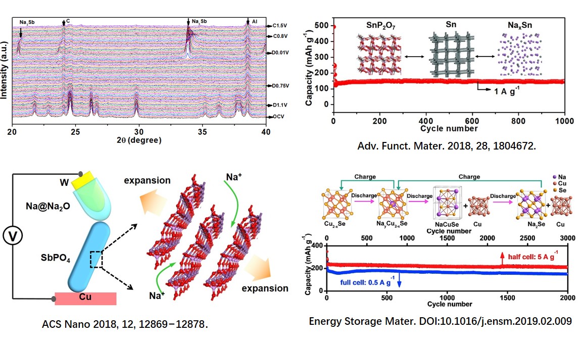 威尼斯官网钱逸泰院士团队杨剑教授课题组近年来在钠离子二次电池研究方面取得新成果。围绕着合金机制钠离子电池负极材料的循环稳定性提升和新材料电化学机制研究方面,取得了系列研究进展。1. 发展聚阴离子的缓冲效应来稳定多种合金机制电极材料的电化学性能,发现聚阴离子对M-O转化反应的促进作用,并利用原位/离位电化学联用技术和第一性原理加以解释。相关成果发表在ACS Nano, 2018; Adv. Funct. Mater., 2018,并被nyxr- home.com,nanoer.net,www.sdchem.com.cn,www.cailiaoniu.com等网站专题报道。2. 揭示了硫族化合物的充放电反应机制,实现了无需炭包覆、预钠化和预活化,全电池即可长寿命循环(2000圈)。相关成果发表在Adv. Funct. Mater. 2017, Energy Storage Mater. 2019, Mater. Today Energy 2018上,并被Materialsviewchina.com, nyxr-home.com,sciencetrends.com等网站专题报道。