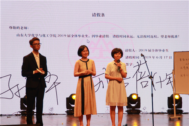 晚会中,还穿插进行了“十年之约”封存仪式、《考研、保研、就业手册》交接仪式以及请假仪式等特色环节,毕业生们通过各种形式表达了对自己、对学弟学妹和对学院的责任与担当。2015级本科生四名班长将班级每个人写给十年后自己的一封信封存在箱子里,并郑重将箱子交给副书记孙国翠保管,以年级名义与学院定下“十年之约”,相约十年后再相见,再由每人亲手拆开这一封来自青春的信件。进入毕业季以来,毕业生将自己的亲身经历集结成册,毕业生代表高欣及在校生代表肖笑园在晚会上完成了《考研、保研、就业手册》的交接仪式。晚会结束之际,孙国翠和刘蓓蓓两位辅导员被毕业生邀请上台,眼含热泪共同签下了一张2019届毕业生集体因毕业请假、时间永远、无法按时返校的特殊假条。在主持人邀请下,晚会的最后,毕业生们纷纷走上舞台,分享毕业感言,表达不舍离情,许多同学情不自禁在舞台上洒下了泪水。
