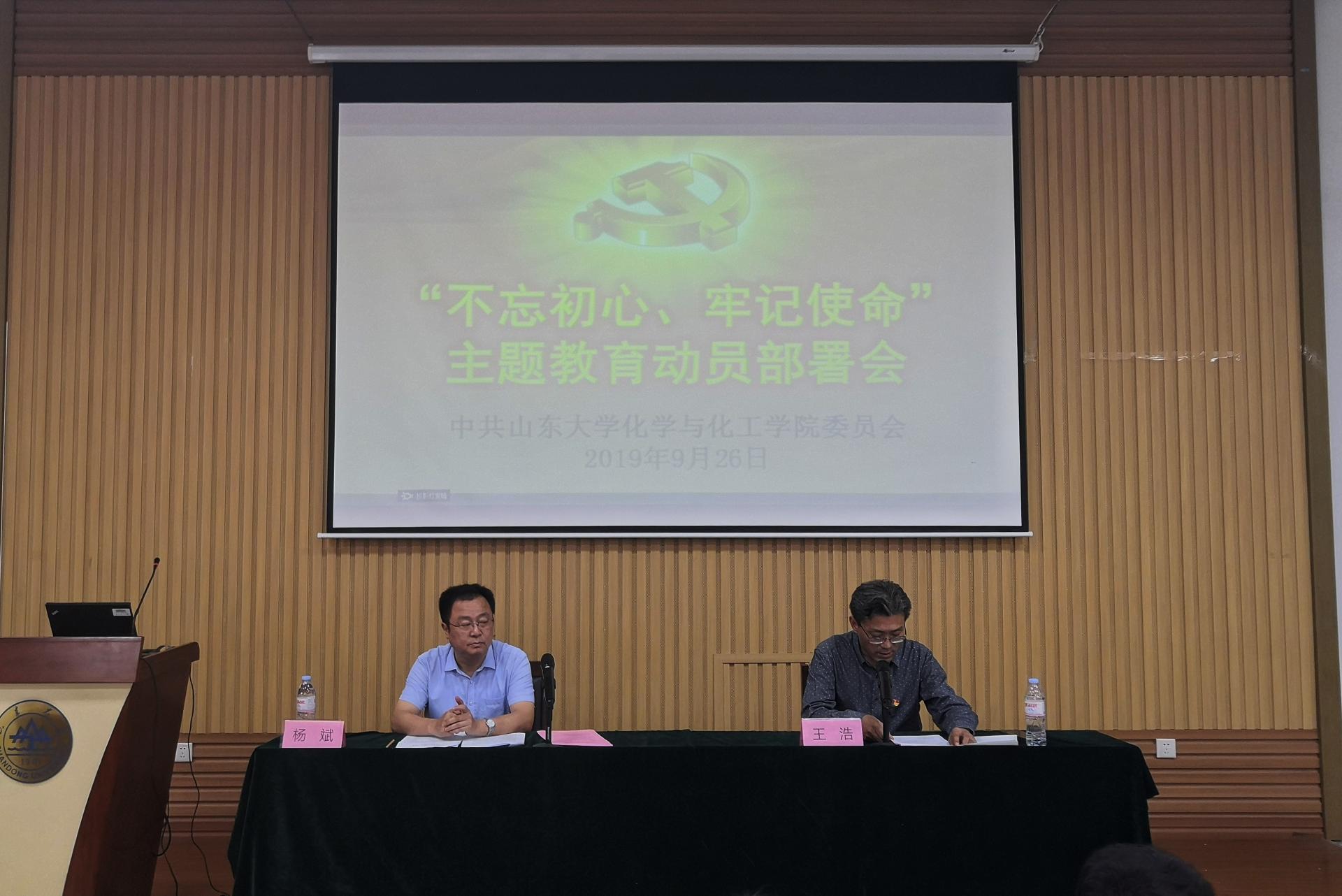 王浩在动员讲话中指出,第一,要深刻认识主题教育的重要意义,以“四个迫切需要”为主题教育的方向,增强政治认同、思想认同、理论认同、情感认同,自觉在思想上政治上行动上同以习近平同志为核心的党中央保持高度一致,引导党员干部把践行党的根本宗旨具体落实到行动上。要将主题教育与化学学科建设结合起来,深刻认识共产党人的初心使命,深刻认识山大人的初心使命,深刻认识化院人的初心使命,将人才培养和科研工作放在首位,把握机遇,迎接挑战,为国家和社会做出山大化学人的应有贡献。第二,要把握守初心、担使命、找差距、抓落实的总要求,聚焦理论学习有收获、思想政治受洗礼、干事创业敢担当、为民服务解难题、清正廉洁作表率五大具体目标,确保主题教育取得实效。第三,把学习教育、调查研究、检视问题、整改落实等四项工作安排贯穿全过程,从严格领导责任、搞好统筹安排、扎实和抓好宣传引导三方面着手,扎实推进学院主题教育工作开展。
