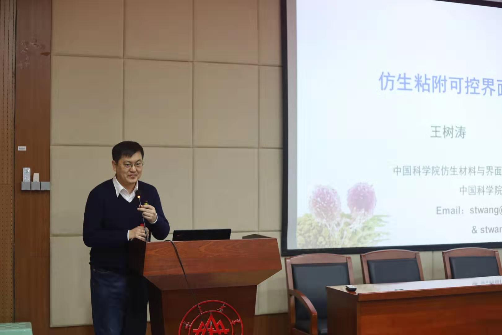 仪式过后,中国科学院理化技术研究所所长助理、长江学者、杰青王树涛开始了“菁英班”开班第一课的讲授,他向同学们简单介绍了中科院理化所的发展历史、发展近况以及科研实力,分析了未来自然科学学科前沿研究领域的交叉趋势,与大家分享了自己的科研工作。他鼓励大家培养多学科交叉思维,“当你读研究生或者工作的时候会发现,很少有纯粹的学科,知识会用得特别综合,所以在读大学时,同学们心中就应种下这颗种子,做好储备”。