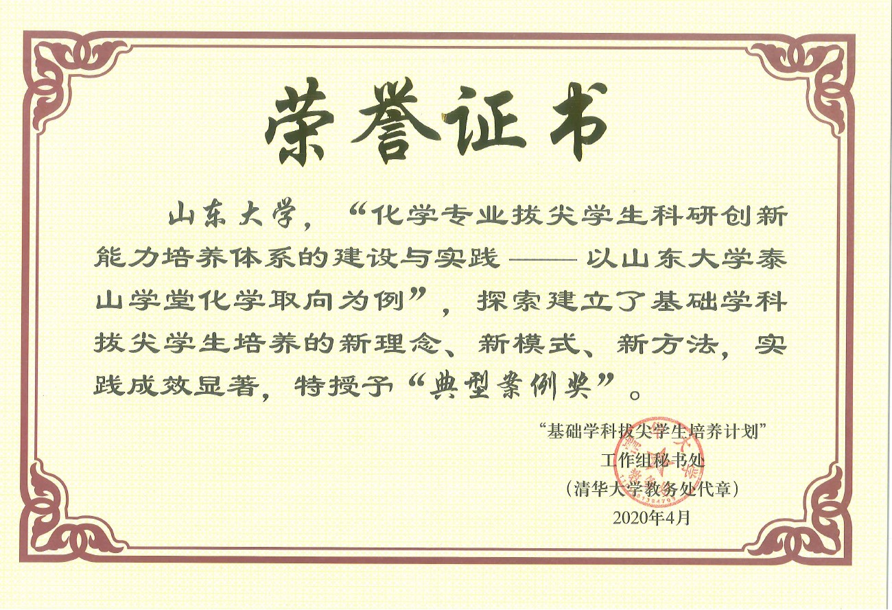 在日常教学管理中,学院选聘有国外访学背景的教授组成教授指导小组,负责拔尖学生培养方案制订、国外交流、学习科创实验指导等,并聘请院内具有科研能力的年轻教师担任班主任,加强学生与教师之间的日常交流。拔尖学生所有课程授课教师均为教授,并进行小班化教学,专业必修课邀请院内杰出人才授课。学院借鉴国内外高校经验,通过完善培养方案及实验体系,加强理论课与实验课的融合,注重科研成果向实验内容的渗透和转化,加强开放创新实验的广度和深度,加强学生动手能力和实验操作技能,极大地调动了学生学习探索兴趣,显著提高了学生的创新能力和科研素养,形成了具有山大特色的化学专业拔尖人才培养模式和机制。经过几年的探索与实践,9778818威尼斯拔尖学生培养成效显著。