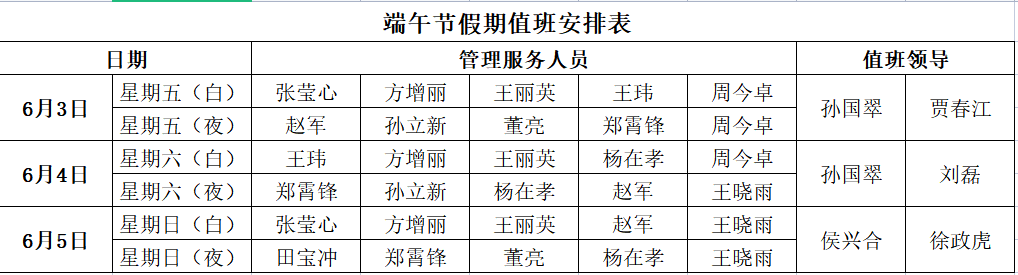 端午节假期,学院按照学校要求安排值班值守,严格执行24小时值班值守制度,1/3领导班子成员和1/4管理服务人员在岗值班(值班安排表附后)。加强假期突发事件应急处置,从严执行信息报告制度,确保假期安全平稳。