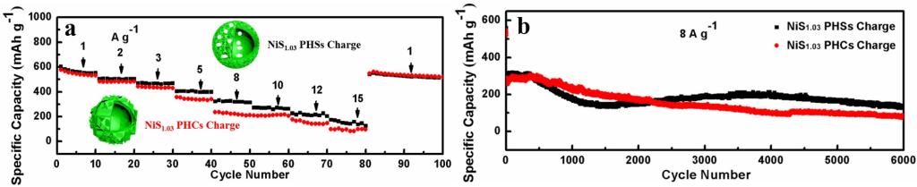 图1:NiS1.03 PHSs和NiS1.03PHCs的倍率性能(a)及在8 A g−1的电流密度下的长循环性能(b)。